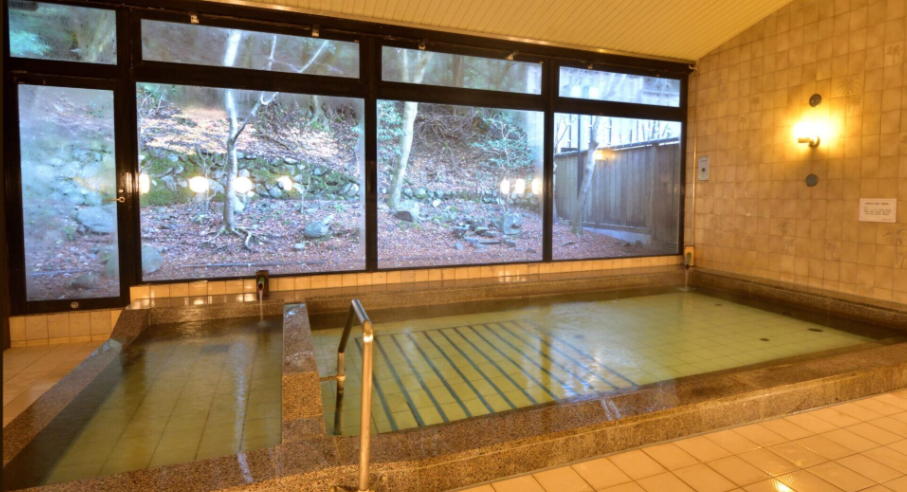 The indoor bath features a spacious bathtub where you can relax while enjoying the lush greenery of the mountains through a large glass window. Visiting in the morning often means fewer guests, so you can enjoy the bath almost privately.