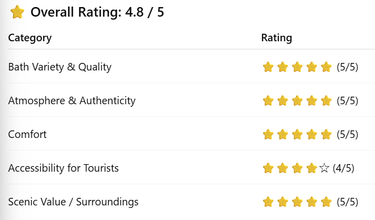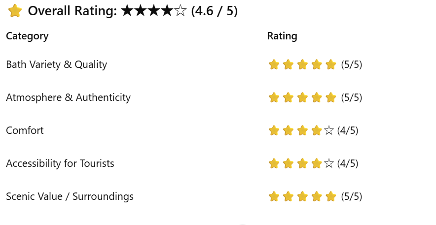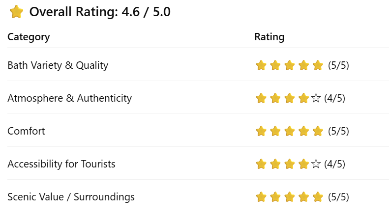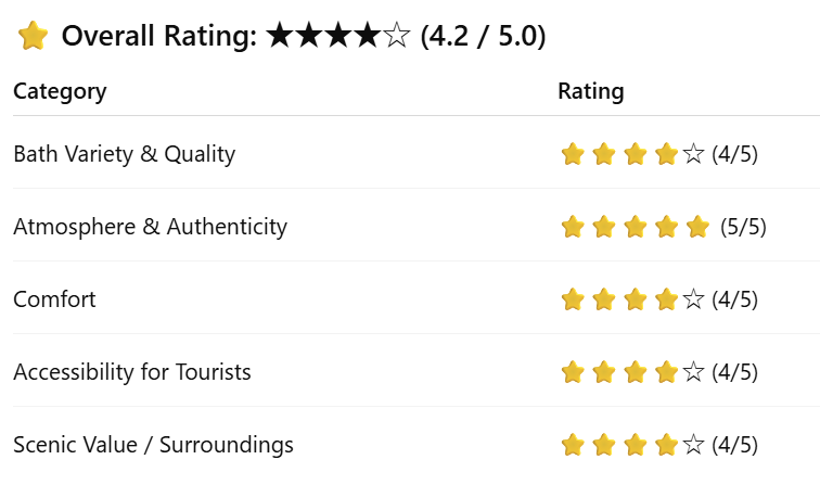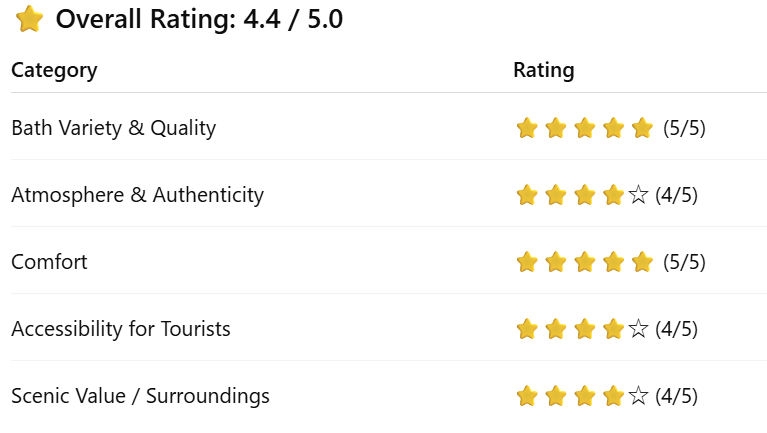The admission fee is very affordable, offering excellent value for money. However, since the facility is compact and mainly consists of bathing areas and a small rest space, a stay of about one to two hours is ideal.